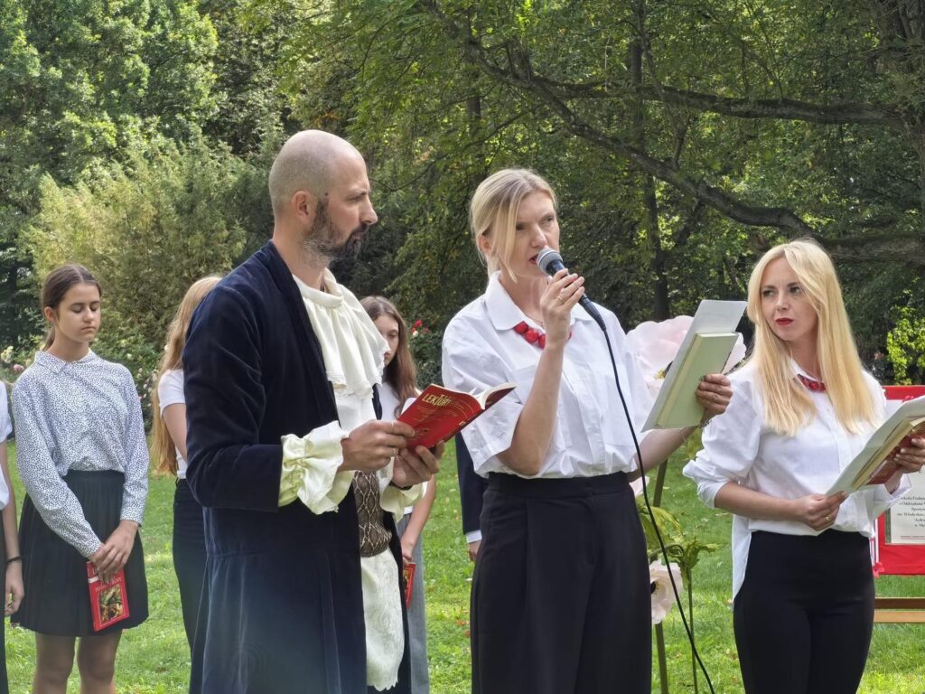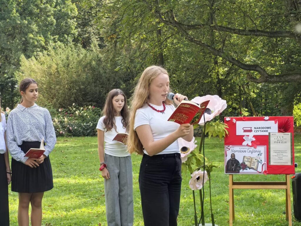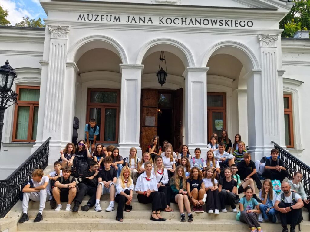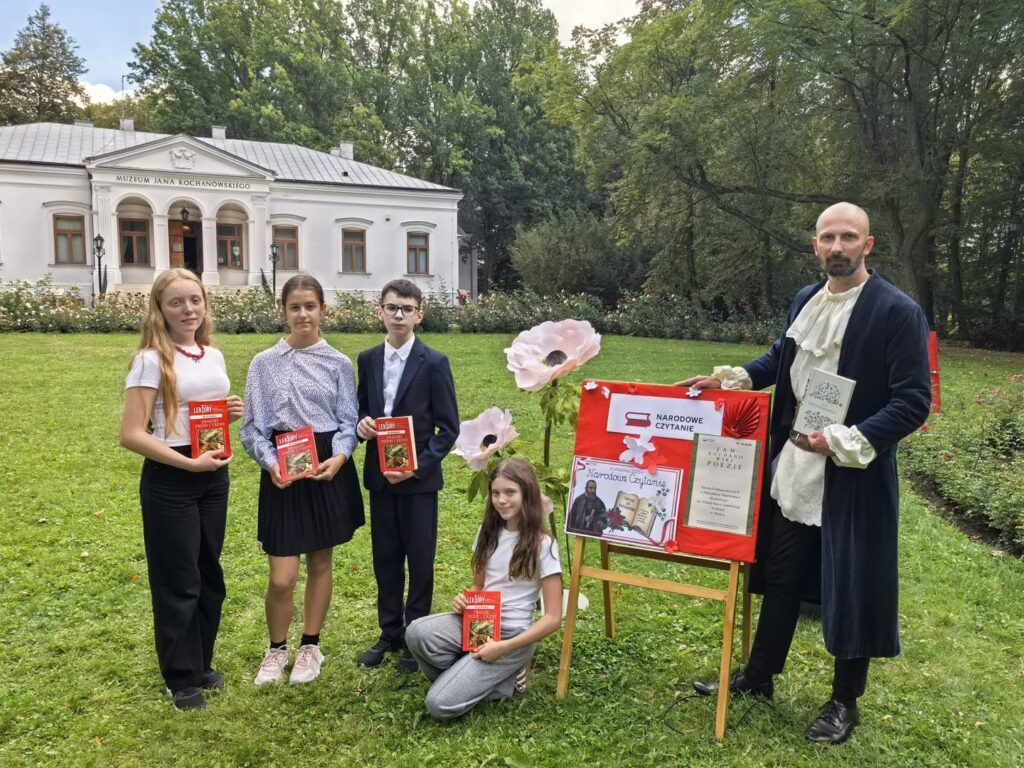W ramach akcji Narodowego Czytania, jak co roku, promowaliśmy polską literaturę i kulturę. Tegoroczną lekturą była poezja ojca polszczyzny, czyli Jana Kochanowskiego. A gdzie jego twórczość wybrzmi piękniej, jak nie w Czarnolesie? Uczniowie klas 7 i 8 wyruszyli zatem do dziedzicznego majątku poety, by tam czytać fraszki, treny i pieśni. Przy okazji zwiedzili też Muzeum Jana Kochanowskiego oraz urządzili sobie piknik „Pod lipą”. Nie mogli w drodze powrotnej ominąć pobliskiego Zwolenia, gdzie znajduje się sarkofag poety. Pomysłodawczynią całego wydarzenia była nauczycielka języka polskiego pani Małgorzata Wesołowska, a towarzyszyły jej: pani Kamila Starzyk – Staniszewska (która uświetniła plastycznie całe wydarzenie) oraz pani Agnieszka Leszkiewicz, wychowawczyni klasy 7a. Czynnie w całe przedsięwzięcie włączył się też pan Mariusz Szęszoł, przewodniczący Rady Rady Rodziców, który zadbał o dokumentację fotograficzno-filmową i sprawił, że Mistrz Jan na chwilę pojawił się w Czarnolesie. Dzięki uprzejmości i życzliwości Dyrektora Muzeum Jana Kochanowskiego pana Ireneusza Domańskiego mogliśmy zorganizować nasze szkolne czytanie w samym sercu parku, czyli w najbardziej reprezentacyjnej jego części. Dziękujemy!